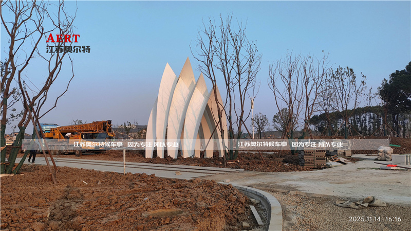 以下是江蘇奧爾特候車亭廠家為江陰設(shè)計(jì)生產(chǎn)的廊架雕塑拱門(mén)(1:1還原):